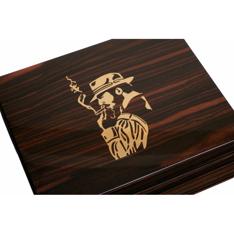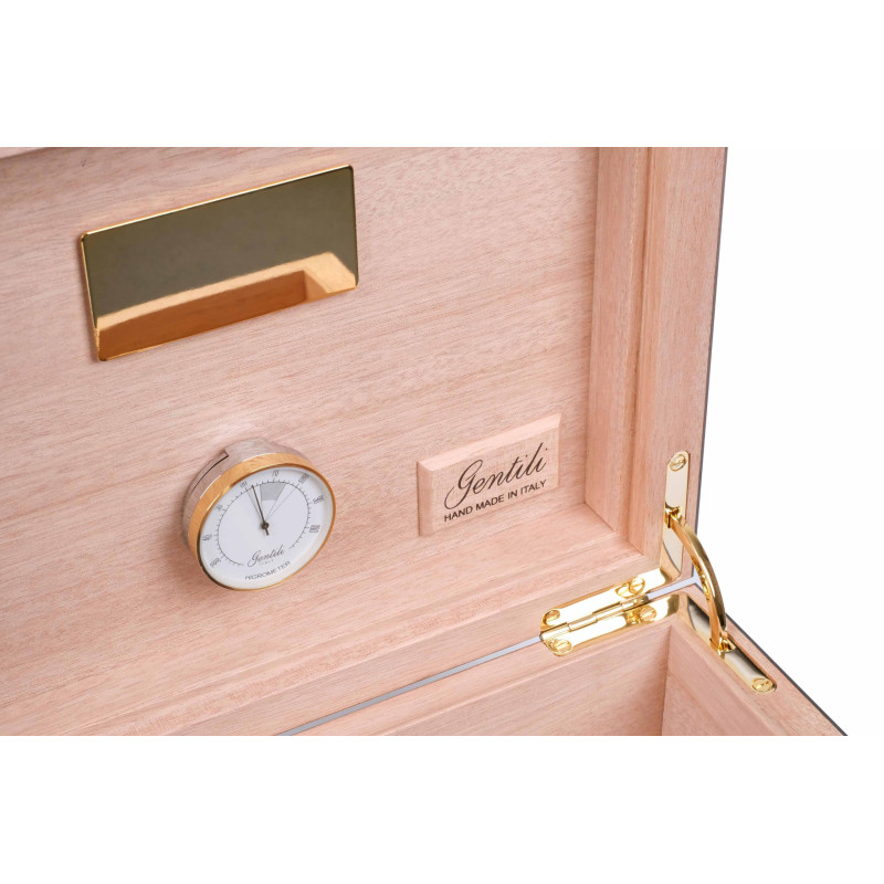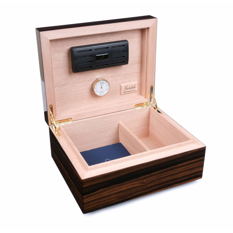 Новый хьюмидор премиум-класса на 50 сигар от итальянских мастеров фабрики Fabrizio Gentili SRL (производителя лучших хьюмидоров по сочетанию цена-качество в своем классе). Модель характеризуется строгим классическим дизайном, подходящим для большинства интерьеров, и безупречностью в исполнении. Корпус представляет собой комбинацию нескольких видов дерева, что обеспечивает стойкость к деформации при колебаниях температуры и влажности, снаружи покрыт шпоном Эбенового дерева из Индонезии. Внутренняя отделка выполнена из испанского кедра. На верхней поверхности хьюмидора вручную выполнен рисунок с финишным покрытием 7-ю слоями рояльного лака. В комплекте увлажнитель с акриловым полимером, итальянский гигрометр, фирменный буклет Gentili с информацией о компании и мультиязычной инструкцией по уходу. Подарочная упаковка. Ручная работа, сделано в Италии. Официальный сайт производителя: https://www.gentili-italy.com