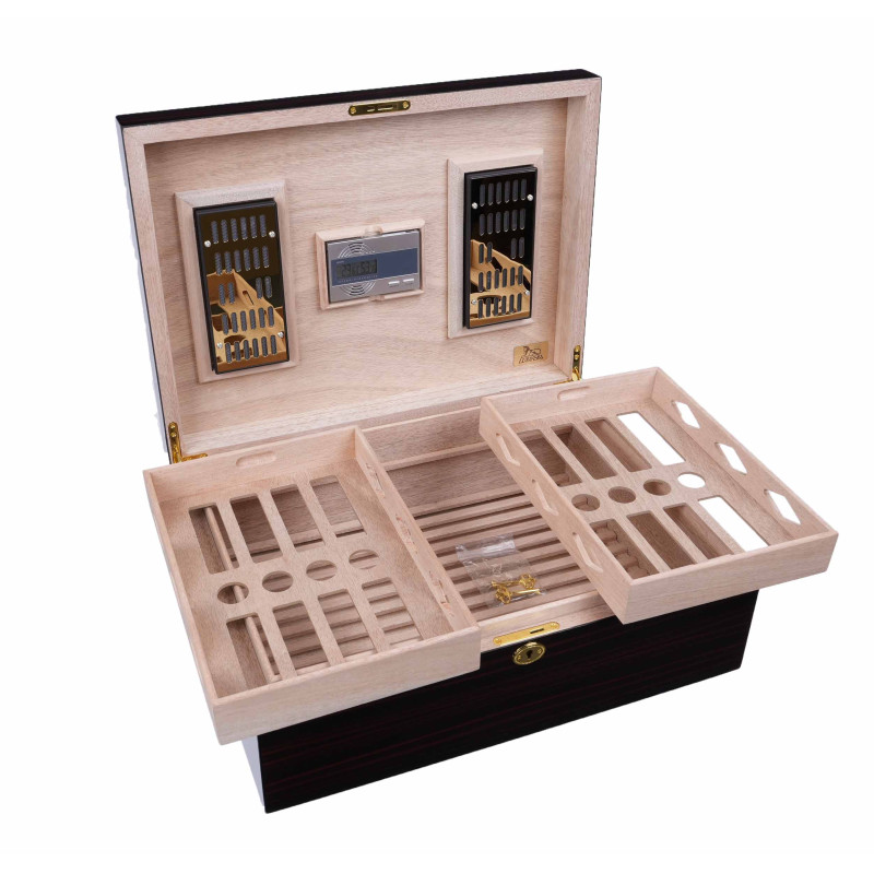 Хьюмидор Lubinski на 120 сигар из эбенового дерева модели Q233 представляет собой воплощение итальянской элегантности, безупречного мастерства и функциональности, созданное для самого взыскательного ценителя, который ценит в аксессуарах не только практичность, но и статус, и стиль. Этот вместительный хьюмидор, произведенный знаменитой итальянской компанией Lubinski, являющейся крупнейшим производителем и дистрибьютором курительных аксессуаров в Италии, станет достойным хранилищем для вашей коллекции и украшением любого интерьера. Его корпус, отделанный благородным и плотным эбеновым деревом с глубоким, почти черным оттенком и выразительной текстурой, покрыт многослойным глянцевым лаком, который не только подчеркивает природную красоту древесины, но и создает прочное, долговечное защитное покрытие, устойчивое к внешним воздействиям. Внутреннее пространство хьюмидора выполнено из высококачественного испанского кедра, известного своими идеальными свойствами для хранения сигар: он естественным образом регулирует влажность, отпугивает табачных жучков и придает сигарам неповторимый аромат. Для обеспечения оптимальной циркуляции воздуха и равномерного распределения влажности на дне хьюмидора предусмотрена съемная кедровая решетка, которая способствует вентиляции и позволяет гибко организовать хранение сигар разных размеров. В комплект входит электронный термогигрометр с функцией калибровки показаний влажности в диапазоне +- 10%, что позволяет с максимальной точностью контролировать и поддерживать идеальный микроклимат для вашей коллекции. Увлажнение обеспечивается современным увлажнителем с акриловым полимером нового поколения, который эффективно и стабильно поддерживает заданный уровень влажности, требуя минимального обслуживания. Хьюмидор поставляется в подарочной коробке, а к нему прилагается подробная инструкция по эксплуатации, которая поможет вам правильно подготовить его к использованию и наслаждаться безупречным хранением сигар долгие годы. Производитель оставляет за собой право вносить незначительные улучшения в конструкцию или комплектацию, что является гарантией постоянного развития и стремления к совершенству. Хьюмидор Lubinski Q233 — это не просто аксессуар, а инвестиция в сохранность вашей коллекции и эстетическое удовольствие, символ утонченного вкуса и преданности традициям табачного искусства.