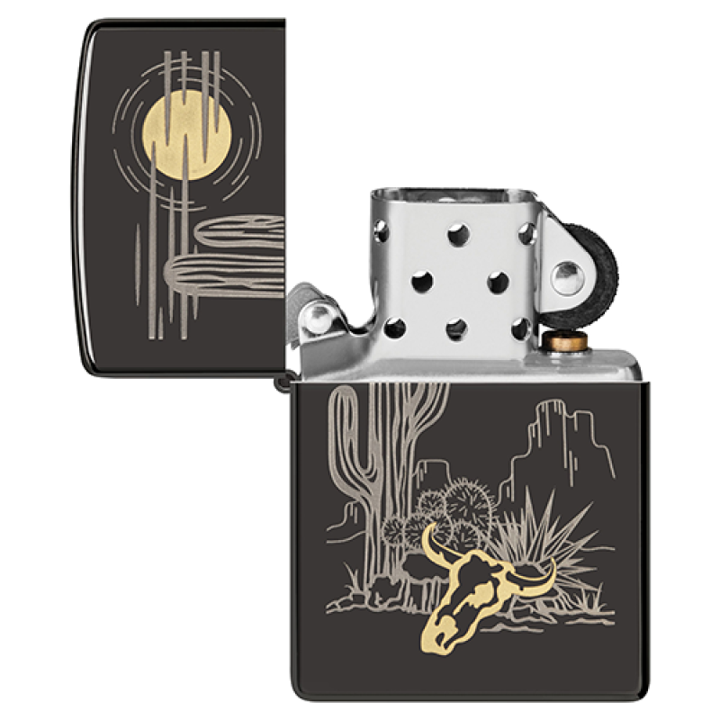 Зажигалка Zippo 48968 Western High Polish Black — это элегантный аксессуар в духе Дикого Запада. Модель из серии Classic выполнена в зеркальном чёрном покрытии High Polish Black. На поверхность нанесён минималистичный двухцветный дизайн с искусной лазерной гравировкой, изображающий пустынный пейзаж в тонких латунных тонах. Зажигалка обладает фирменной ветроустойчивой конструкцией, узнаваемым щелчком и прочным металлическим корпусом, обеспечивающим надёжность в любых условиях. Благодаря системе многократной заправки, эта зажигалка станет вашим долговечным спутником. Для оптимальной работы рекомендуется использовать только оригинальные кремни, фитили и высококачественное топливо Zippo.