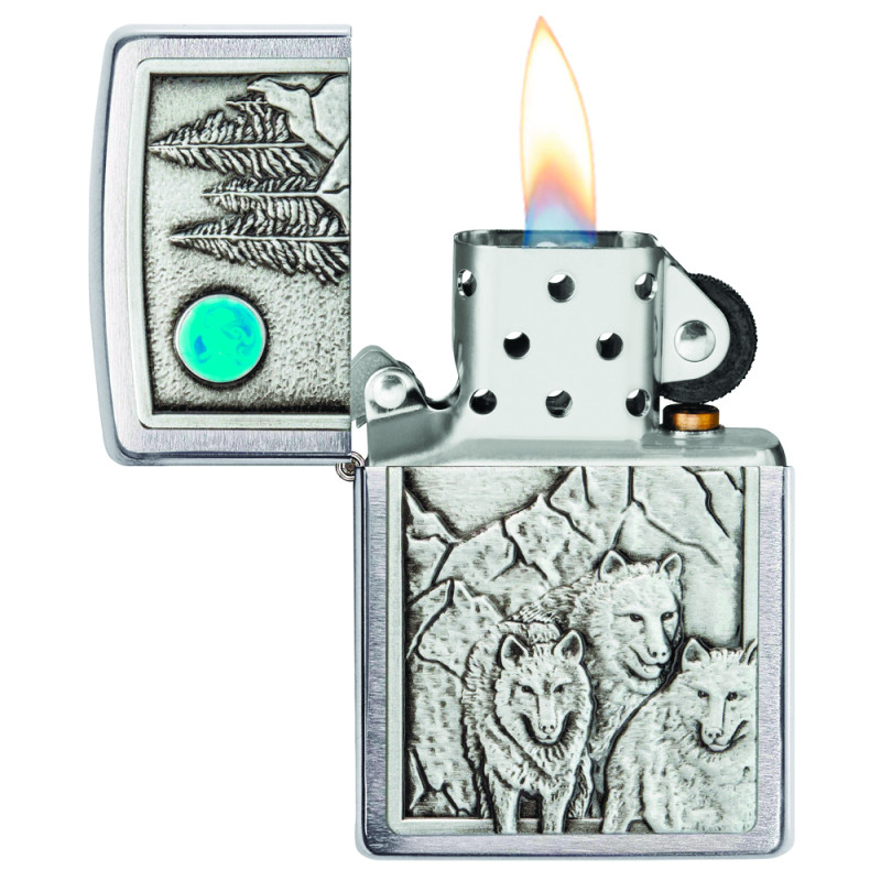 Особенности: Матово-хромированное покрытие, дизайн с волком, ветроустойчивость, фирменный щелчок, система многократной заправки